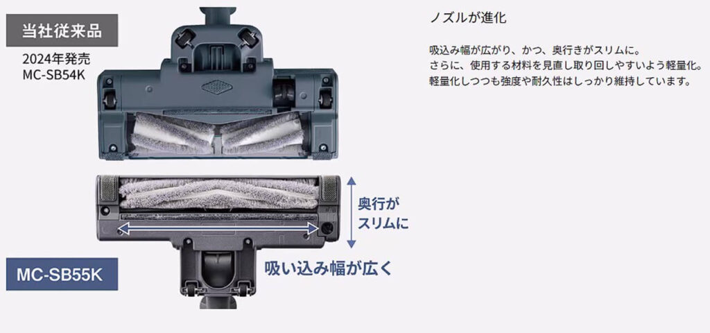 MC-SB55Kでは吸い込み幅が広がり、奥行きがスリムな床用ノズル形状を採用
